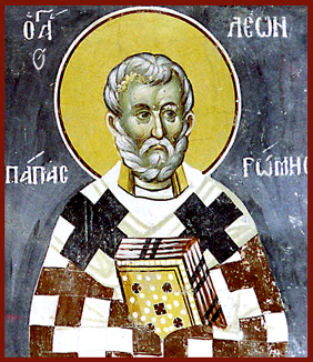 ΑΓΙΟΣ ΛΕΩΝ, ΠΑΠΑΣ ΡΩΜΗΣ      ΒΙΟΓΡΑΦΙΑ    O Άγιος Λέων υπήρξε από τους μεγαλύτερους υπερασπιστές και προμάχους της ορθόδοξης πίστης. Έζησε στο χρόνια του αυτοκράτορα Μαρκιανού και Πουλχερίας. Διακρινόταν για την μεγάλη θεολογική του κατάρτιση, το ήθος του χαρακτήρα του, την αγνότητα του βίου του. Διετέλεσε Επίσκοπος της πρεσβυτέρας Ρώμης.Σημαντικότατη ήταν η συμβολή του στις εργασίες της Δ’ Οικουμενικής Συνόδου, όταν απέστειλε τέσσερις αντιπροσώπους, ως και επιστολή στην οποία με πλήρη ακρίβεια και βάσεις της αποστολικής παραδόσεως, καθόριζε τις δύο φύσεις του Χριστού, η οποία βοήθησε στη διεξαγωγή των συζητήσεων ως και στη συγγραφή των τελικών όρων της Συνόδου (για την ακρίβεια η επιστολή του Αγίου Λέοντος είχε σταλεί τρία χρόνια πριν στον Πατριάρχη Κων...