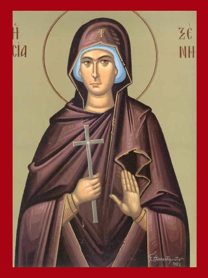 ΑΓΙΑ ΞΕΝΗ, ΟΣΙΑ       ΒΙΟΓΡΑΦΙΑ   Η Οσία Ξένη έζησε τον 5ο μ.Χ. αιώνα. Ονομαζόταν στην αρχή Ευσεβεία και καταγόταν από τη Ρώμη.Αρνούμενη τη πίεση των γονιών της να νυμφευθεί άνδρα της επιλογής τους, φεύγει κρυφά στην Αλεξάνδρεια όπου μετονομάσθηκε Ξένη για να χαθούν τα ίχνη της. Πηγαίνει στο νησί της Κω και στη συνέχεια εγκαθίσταται στα Μύλασσα της Καρίας. Εκεί, μαζί με δύο υπηρέτριές (θεραπαινίδες) της που της είχαν μείνει πιστές, έκτισε ναό στο όνομα του αγίου πρωτομάρτυρα Στεφάνου και ησυχαστικά κελιά.Πολύ γρήγορα η φήμη της και η ενάρετη και ασκητική ζωή που διήγε έφεραν κοντά της νέες κοπέλες που ποθούσαν το βίο της άσκησης και της προσευχής, ενώ το μοναστήρι έγινε περίφημο πνευματικό κέντρο, όπου καθημερινά συνέρεαν πολλές πονεμένες γυναίκες για να πάρουν ...