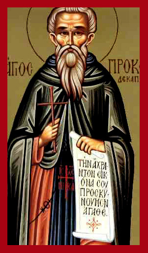 ΑΓΙΟΣ ΠΡΟΚΟΠΙΟΣ Ο ΔΕΚΑΠΟΛΙΤΗΣ, ΟΣΙΟΣ     ΒΙΟΓΡΑΦΙΑ   Ο Όσιος Προκόπιος ο Δεκαπολίτης έζησε στα χρόνια του εικονομάχου αυτοκράτορα Λέοντος του Ισαύρου (717 - 741 μ.Χ.) και διακρίθηκε για την πνευματική γενναιότητά του ως υπέρμαχος της Ορθοδοξίας. Αν και από νεαρή ηλικία ακολούθησε το μοναχισμό, δεν έμεινε στην απομόνωση του κελιού του, αλλά αγωνίσθηκε σθεναρά κατά των εικονομάχων. Γι’ αυτό υπέστη πολλά βασανιστήρια, μαστιγώσεις, φυλακές και εξορίες. Διακρίθηκε, επίσης, στον αγώνα της Εκκλησίας κατά των αιρετικών Μονοφυσιτών.Ο Άγιος Προκόπιος φαίνεται ότι λίγο μετά την αποφυλάκισή του κοιμήθηκε, ενώ κατ’ άλλους υπέμεινε μαρτυρικό θάνατο.     Απολυτίκιον. Ήχος α’. Της ερήμου πολίτης.Φερωνύμως προκόπτων εν ασκήσει Προκόπιε, ήρθης εκ δυνάμεως Πάτερ, προς αθλ...